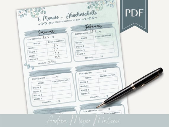 👉 Startgewicht und wöchentlicher Gewichtsverlust – übersichtlich für 6 Monate auf einer einzigen DIN-A4-Seite.