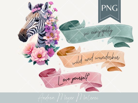 Bring a touch of wildness, gentleness, and personality to your DIY projects with this lovingly designed floral-style zebra motif. The bundle includes a high-resolution zebra PNG (300 dpi, transparent background) and three matching banners that you can freely combine—or use the zebra on its own.